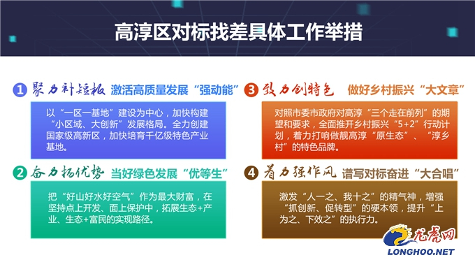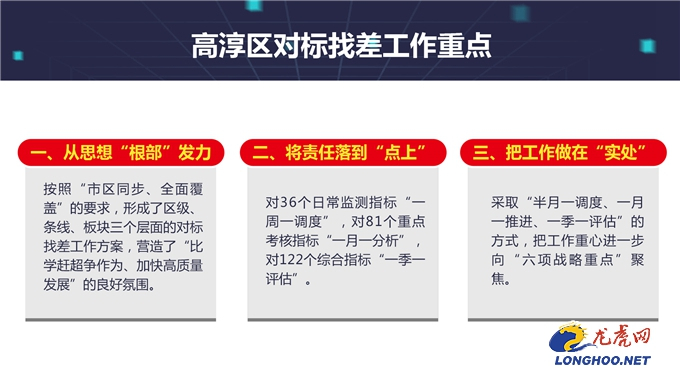 为响应市委市政府号召,在对标找差、创新实干,推动高质量发展中,高淳区树立学习赶超目标,查找自身不足,认清差距,加快建设南部副城。在今天的直播中,高淳区委副书记黄亦武介绍,把对标找差创新实干推动高质量发展作为贯穿各项工作的主旋律,牢牢锁定现代活力新副城、美丽南京示范区、创新名城南部支点“一城一区一支点”发展定位,构建改革开放大格局、扛起民生幸福大担当“六项战略重点”,深入开展“对标金坛,学赶新昌”活动。
